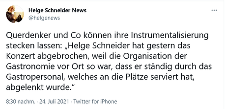 Der Versuch gewisser Kreise, den Konzertabbruch zu instrumentalisieren und SCHNEIDER als Revoluzzer gegen das Establishment aufzubauen, wurde wohl auf anraten seines Managements postwendend per Twitter vereitelt, dort nämlich ist zu lesen: